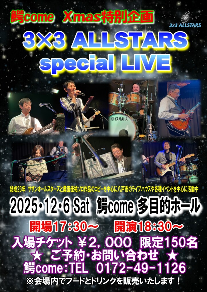 2025.11.22 鰐come「3×3オールスターズスペシャルライブ」のお知らせ 12月6日(土)に鰐comeにて「3×3オールスターズスペシャルライブ」が開催されます。 ぜひ12月6日は 大鰐町地域交流センター 鰐come(ワニカム)へご来場ください。 Post Share Hatena RSS 「大鰐冬ねぷた」開催のお知らせ 最近のお知らせお知らせ一覧 2025.11.19 「大鰐冬ねぷた」開催のお知らせ 2025.11.14 「まるごと大鰐秋の感謝祭」ステージイベント「のど自慢」参加者募集 2025.11.12 「まるごと大鰐秋の感謝祭」開催のお知らせ 2025.11.11 11月11日は『もやしの日』! 2025.11.07 まるごと大鰐秋の感謝祭特集ページの情報を更新しました。