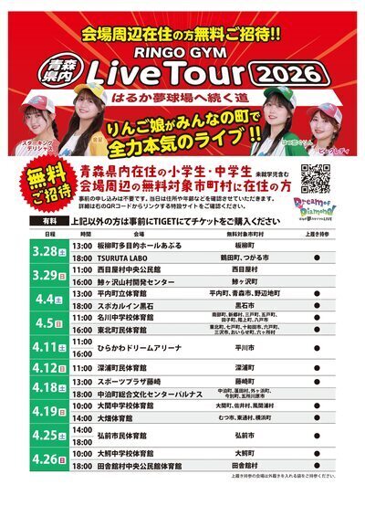 大鰐中学校で「【大鰐公演】りんご娘 青森県内 Live Tour 2026 RINGO GYM 〜はるか夢球場へ続く道」が開催されます。